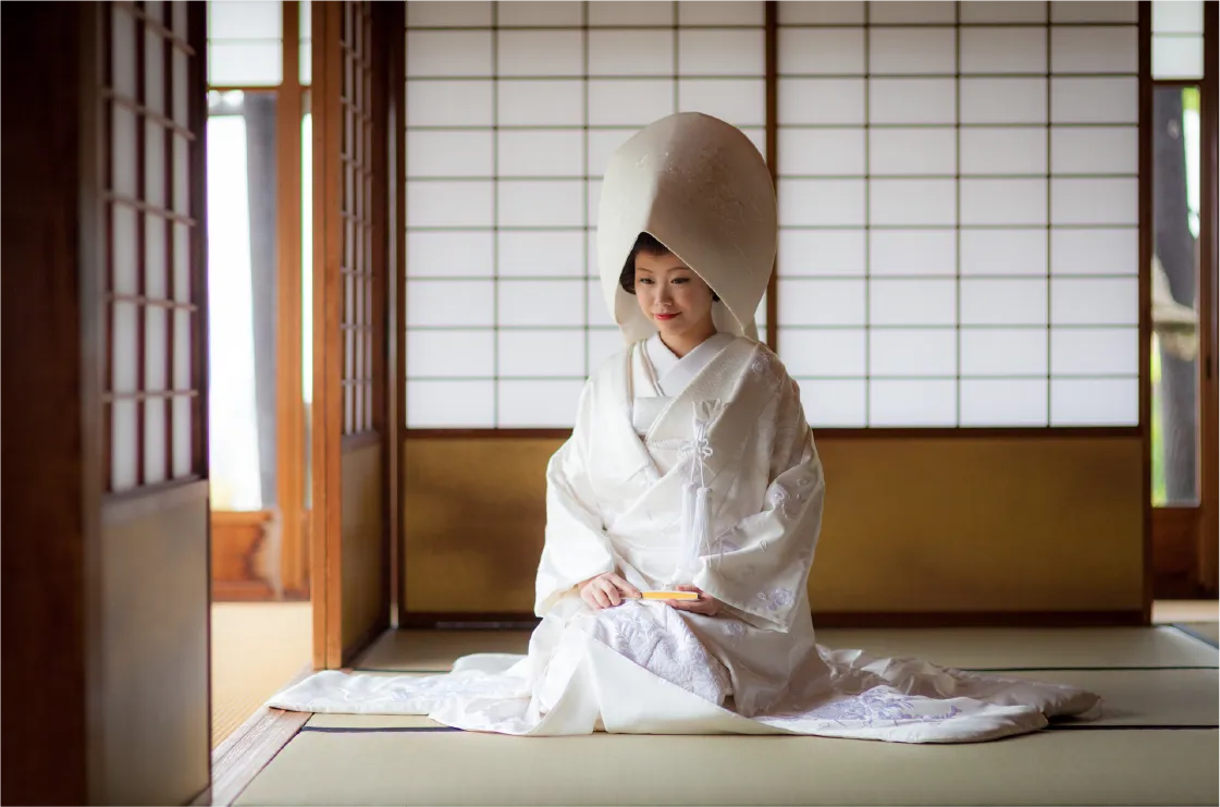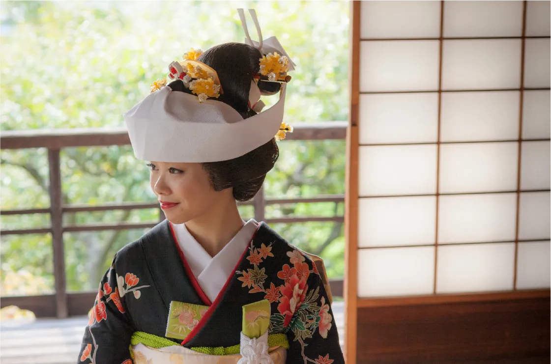 現在では「白無垢+角隠し」「白無垢+綿帽子」