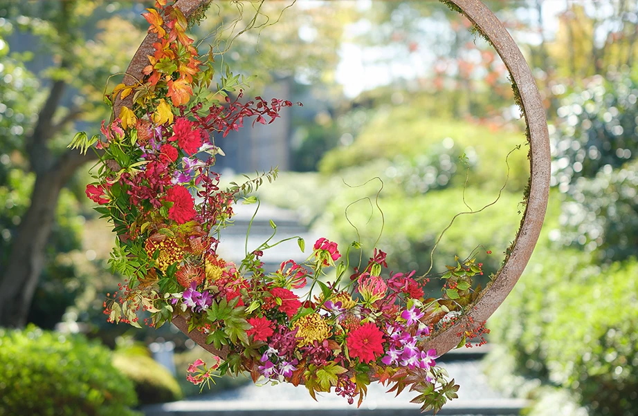 披露宴会場のお花は素晴らしいもので、式を彩ってくれました。また、10時には山門の飾りつけができており、義父母が到着した際には見ていただくことができました。