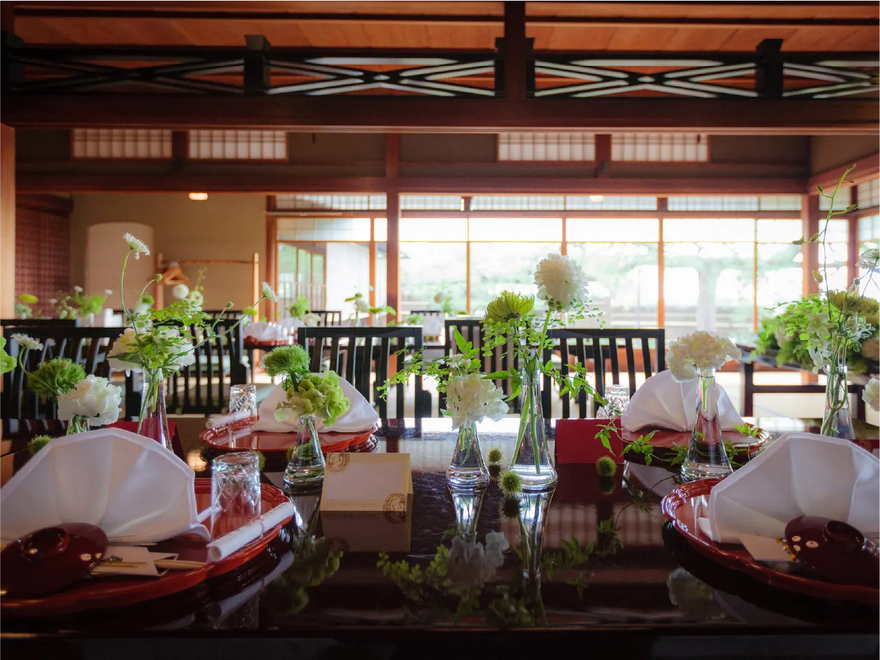 古より大切に引き継がれ、先人たちも同じ空間を愛でた「翠紅館」で、 窓の外に広がる景色を楽しみつつ、ゆっくりとお過ごしください。